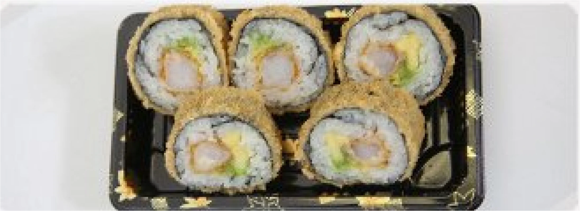 Gefrituurde garnalen, komkommer, avocado en teriyaki mayonaise